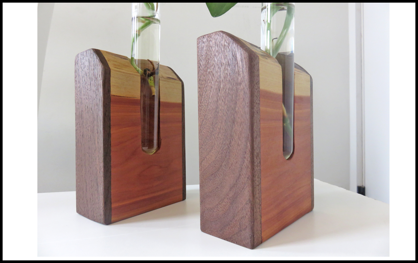 Cedar wrapped with walnut. Each piece holds a 1.25 inch diameter tube. 7"h x 4.5"w x 2.5"d.