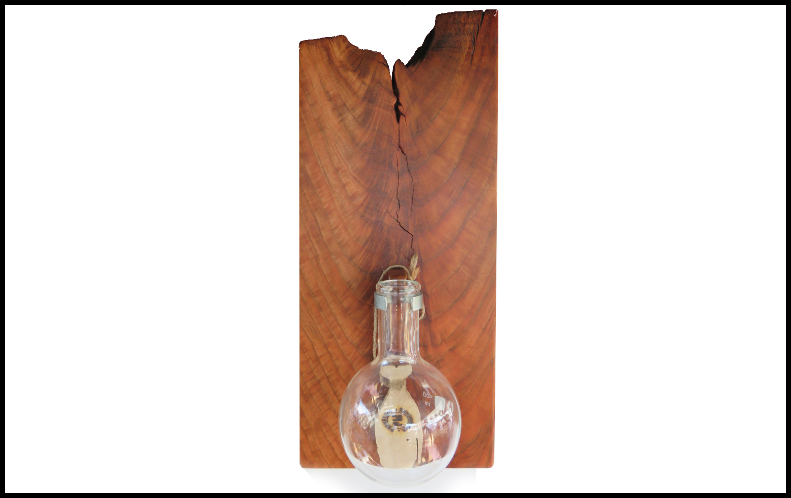 Custom made hanging planter. Holds a 500ml, 4" inch wide by 7" high round bottom flask. Approximate size is 8" wide x 19" high x 3/4" thick.