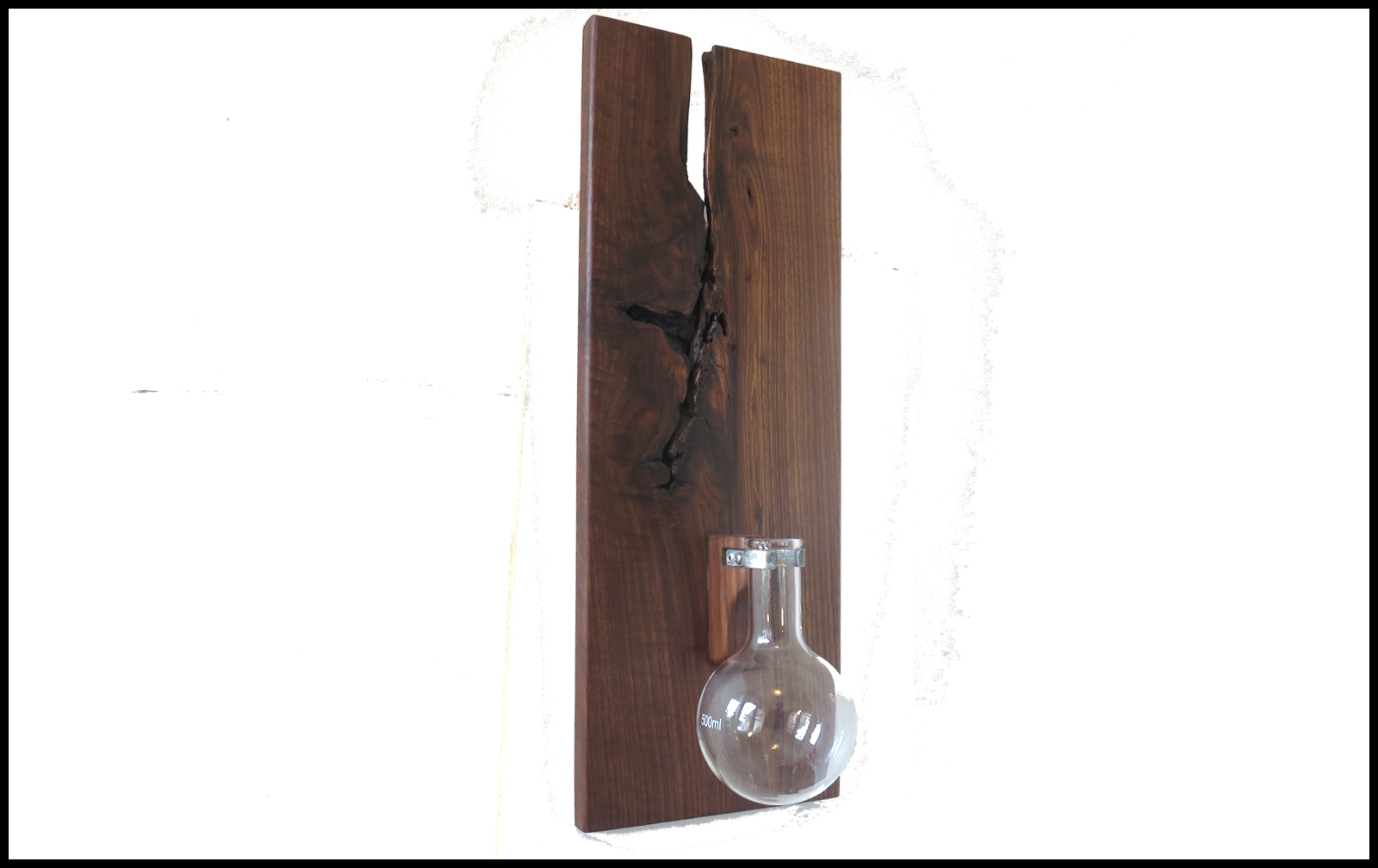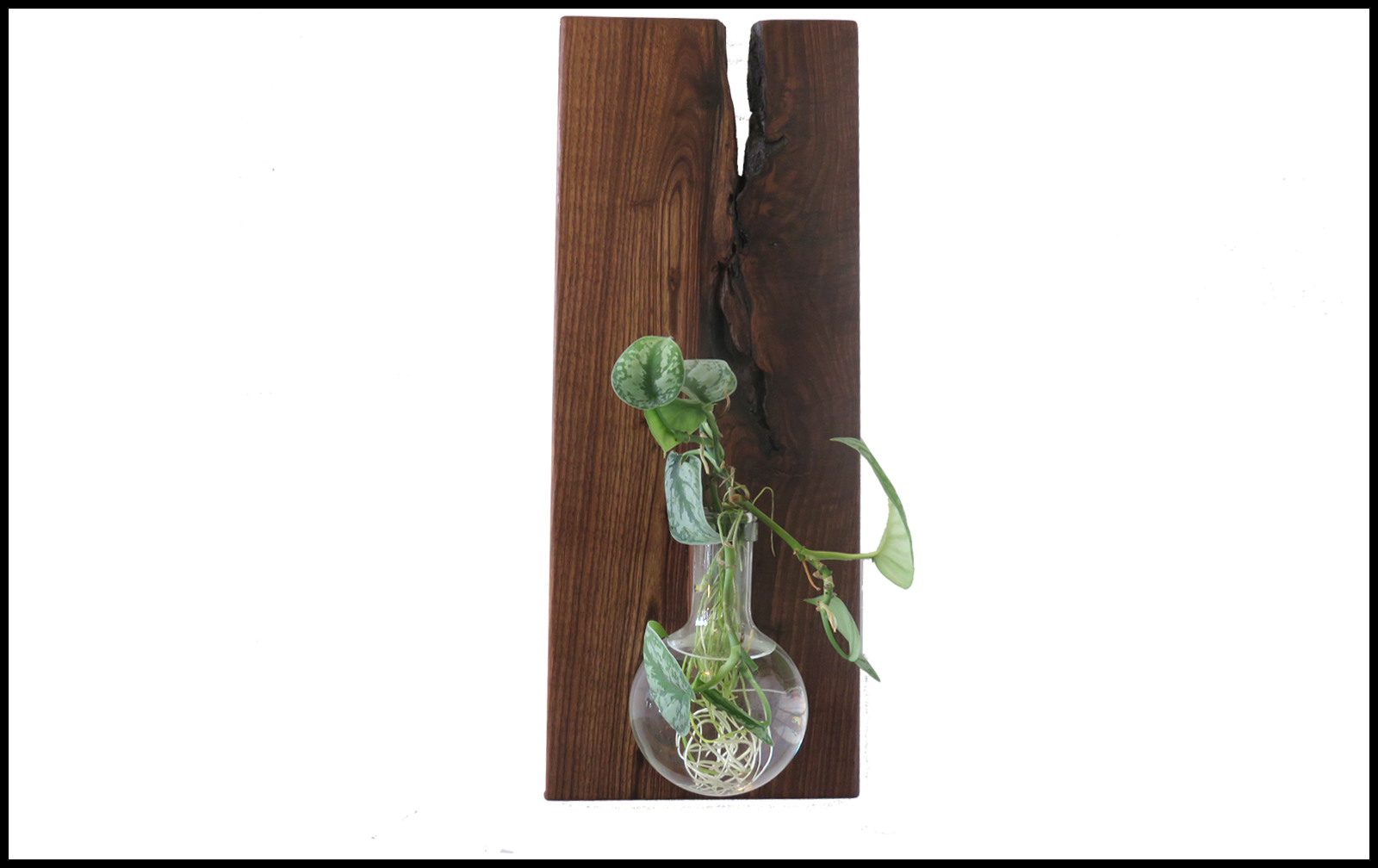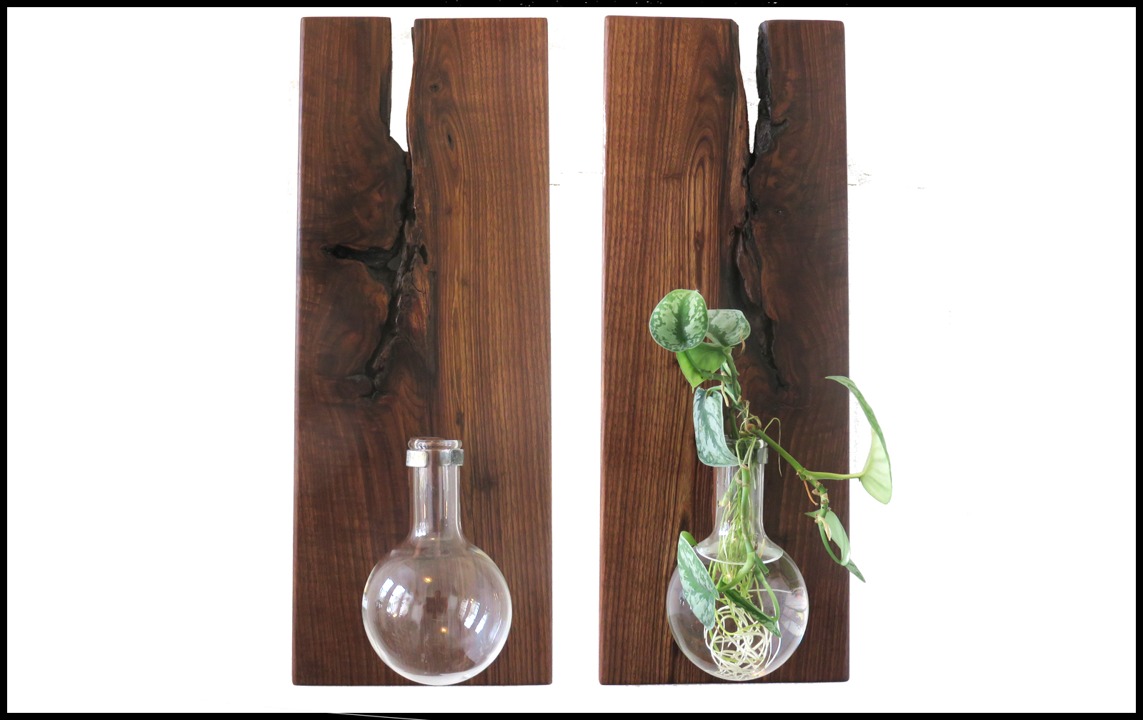 Bookmatched pair of hanging planters. Holds a 500ml, 4" inch wide by 7" high round bottom flask. Approximate size is 8" wide x 22" high x 3/4" thick.