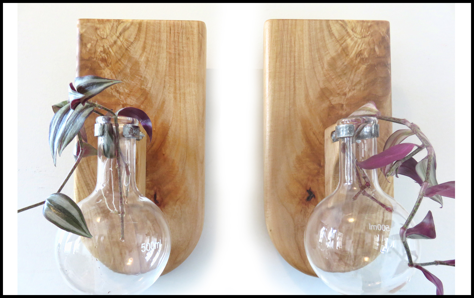 A bookmatched pair of hanging planters. Each holds a 500ml, 4" inch wide by 7" high round bottom flask. Approximate size is 6.5" wide x 14" high x 3/4" thick.